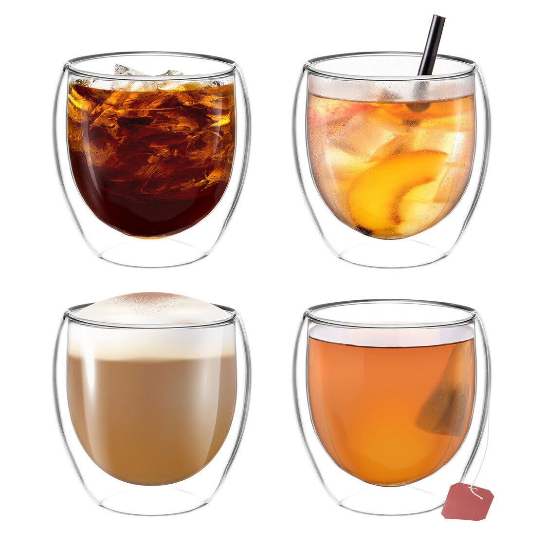 Ervaar de perfecte combinatie van stijl en functionaliteit met onze hoogwaardige dubbelwandige glazen, beschikbaar in inhoud van 250 ml en 350 ml. Deze set van 4 glazen is ideaal voor elke gelegenheid, of je nu geniet van een warme kop koffie, een verfrissende smoothie of een elegant dessert.