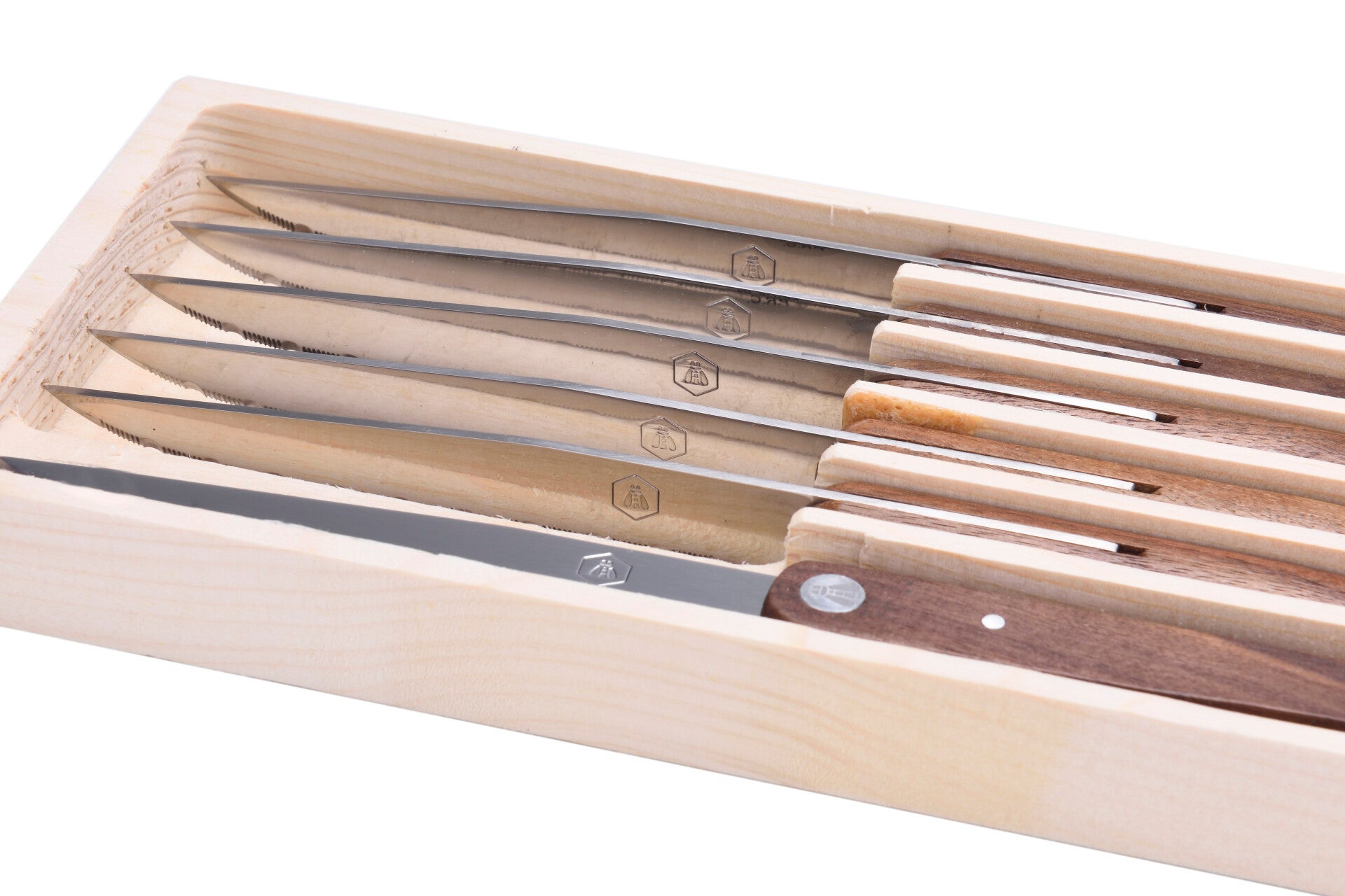 Ontdek de LAGUIOLE steakmessen set van 6, perfect voor de echte vleesliefhebber. Deze hoogwaardige steakmessen zijn voorzien van microtanden, waardoor je moeiteloos door ieder stuk vlees snijdt. Gemaakt van robuust walnoot hout, bieden deze messen niet alleen duurzaamheid, maar ook een luxe uitstraling die perfect past bij elk dinermoment.