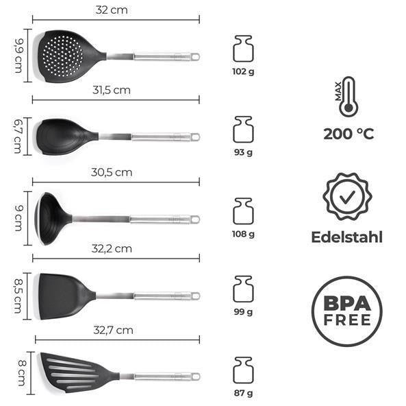 Compleet en Veelzijdig: De set bevat een lepel, een spatel, een opscheplepel en andere essentiële tools die perfect zijn voor een verscheidenheid aan kooktechnieken, van bakken tot roerbakken.
