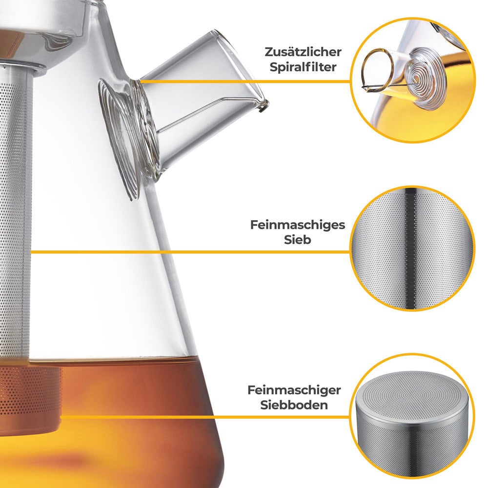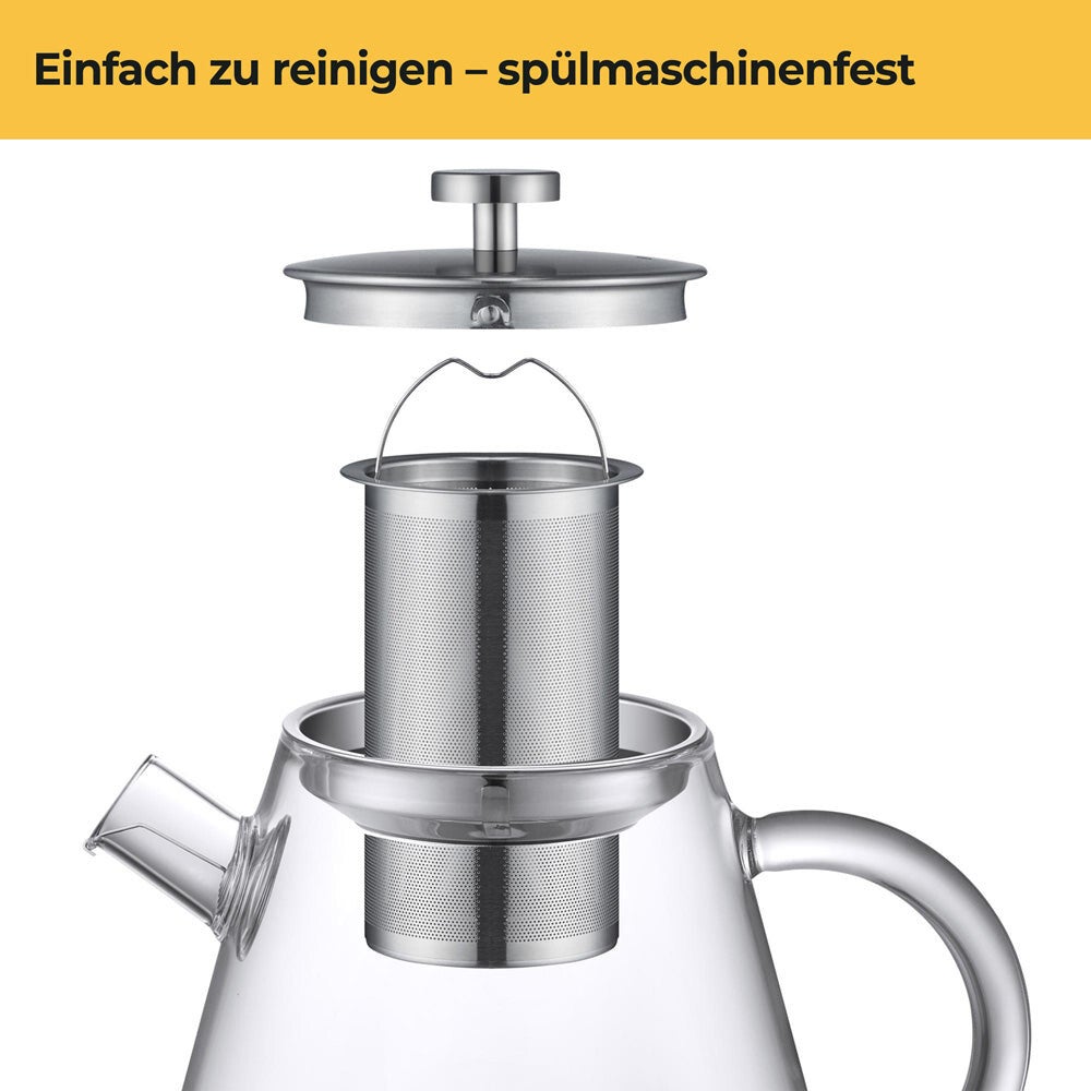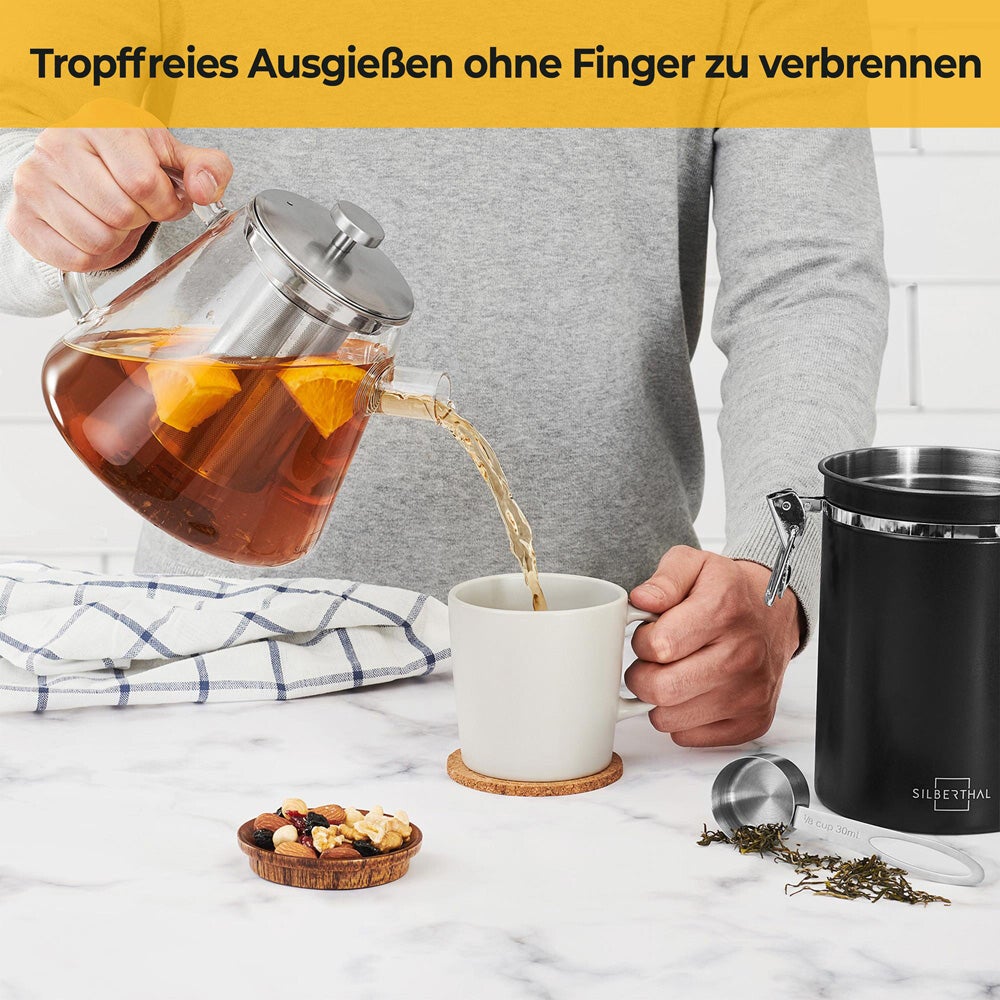 De SILBERTHAL Theepot glas met filter is de ideale keuze voor elke theeliefhebber die houdt van kwaliteit en stijl. Met een royale inhoud van 1,5 liter is deze theepot perfect voor het zetten van 10-12 kopjes thee, ideaal voor gezellige bijeenkomsten of een stille ochtend voor jezelf.